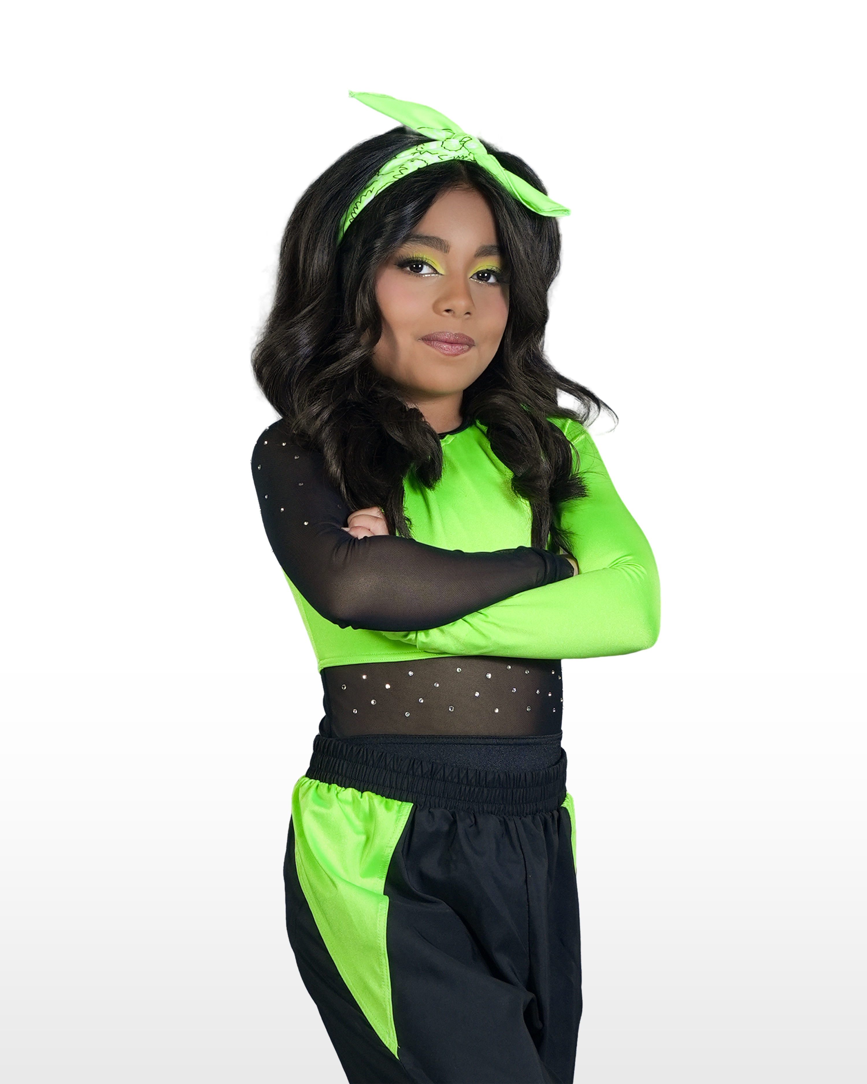 Hairstyle: Hair curled with bandana tied at the top of head - Be sure to bobby pin bandana to keep it secure - Click For Image