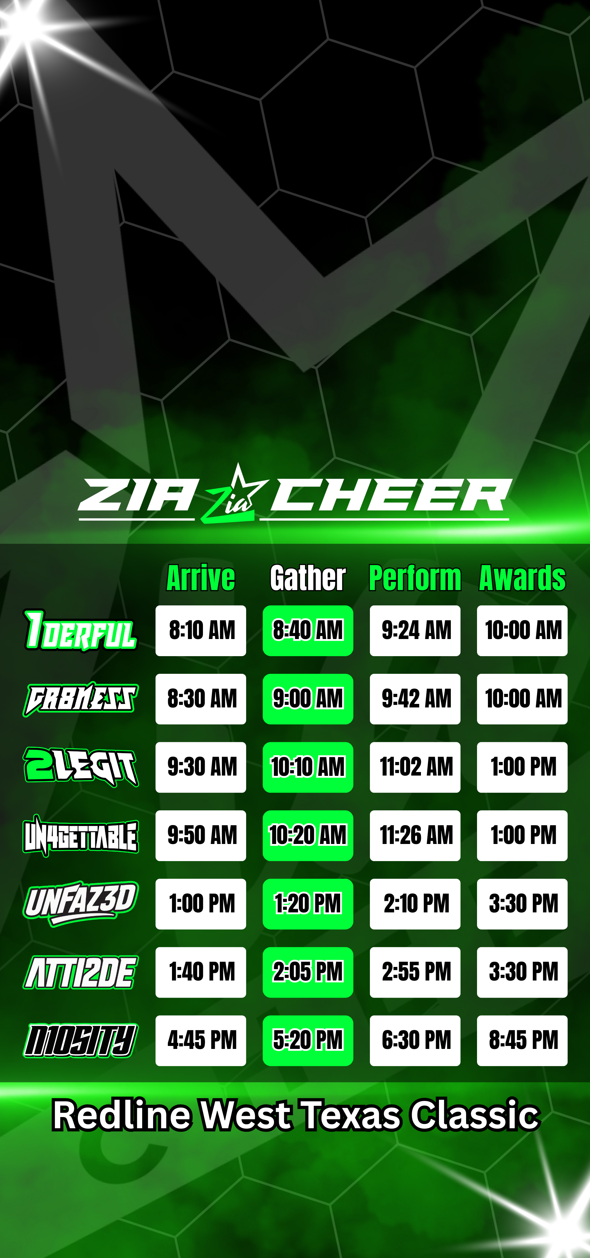 - Support at least one other Zia Cheer team while you’re at the event. A loud, positive crowd means so much to our athletes.